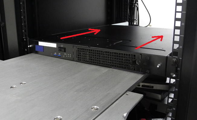 6.From the rear of the server rack, pull the appliance back towards you until the sliding rear brackets fit into the side rails. Pull the appliance back onto the rear brackets until the front ear brackets meet the equipment rack.