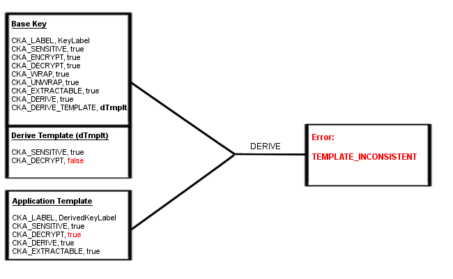 Here, the base key has the CKA_DERIVE_TEMPLATE attribute pointing to the derive template dTmplt. Notice that dTmplt has the CKA_DECRYPT attribute set to false, where the application template has the CKA_DECRYPT attribute set to true. This conflict causes the derivation operation to fail with the error TEMPLATE_INCONSISTENT.