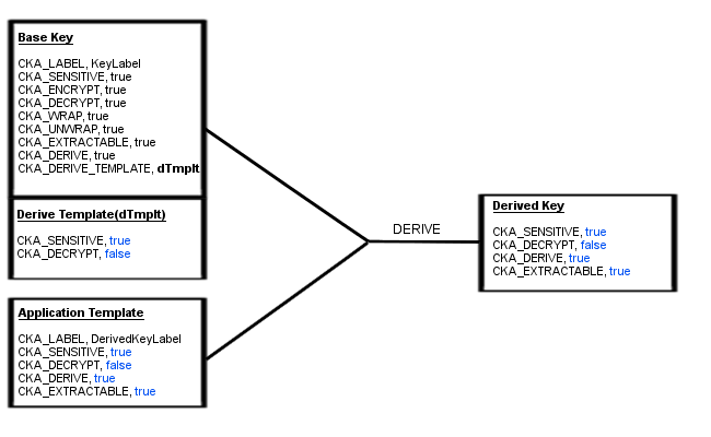 To invoke a derive template, the base key must have the CKA_DERIVE_TEMPLATE attribute set, pointing to a user-supplied derive template. When you specify this attribute on the base key and then attempt to derive a key, the derive operation adds the attributes of the application template to the attributes in the derive template. If there are any mismatches between attribute values specified in the two templates, the derive operation fails. Otherwise, the operation succeeds, producing a derived key with the combined attributes of the two templates.