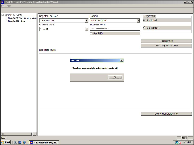 6.In the "Slot Password" field, type in the password for the indicated slot. To the right of the window, click the Register Slot button to register the slot for Domain/User. A success message appears.