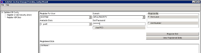 7.Return to the "Domain" pull-down list select "SYSTEM" under "Register for User"and select "NT AUTHORITY" under "Domain", supply the password for the slot being registered, and again click Register Slot to complete the KSP configuration.
