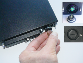 Use the battery compartment cover to push the battery into the compartment, against the spring tension. Maintaining the pressure, align the two tabs on the inside of the cover with the two recessed indentations at the top and bottom of the compartment opening. With a little jiggling and a few trial pushes, the tabs should settle into those recesses, allowing the cover to seat flush with the front of the SafeNet Luna Backup HSM. Maintain the inward pressure and twist the cover ¼ turn clockwise to lock it in place. The battery is installed. |