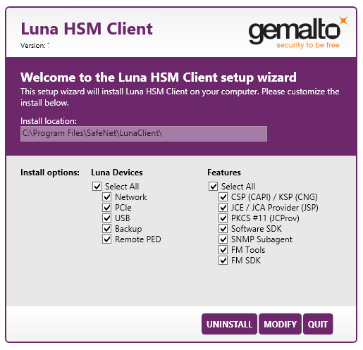2.Uninstall any previous versions of the Client software before you proceed (see Uninstalling the SafeNet Luna HSM Client Software).