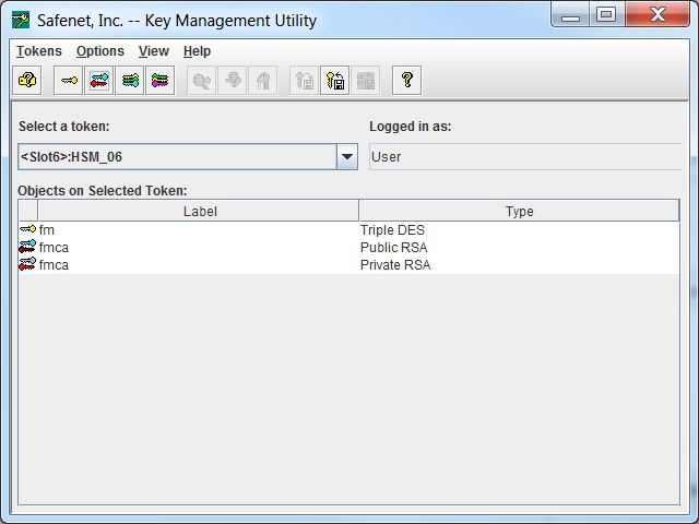 When the KMU is started, all toolbar functions are initially disabled. The user must first select a Token from the Select a token drop-down box, which will list all available tokens. Initialized tokens are displayed by their assigned label name. Uninitialized tokens are displayed as <Slotn>:<uninitialized token>.