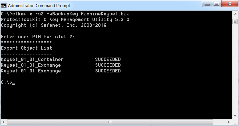 Note: Users are responsible for backing up their own keysets and the SafeNet ProtectToolkit-M device administrator is responsible for backing up the MACHINE and SYSTEM keysets.