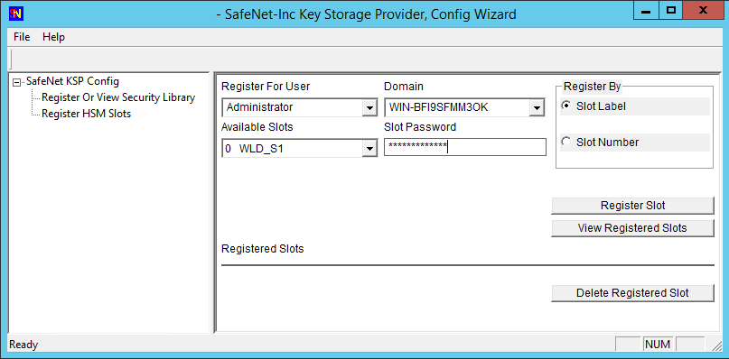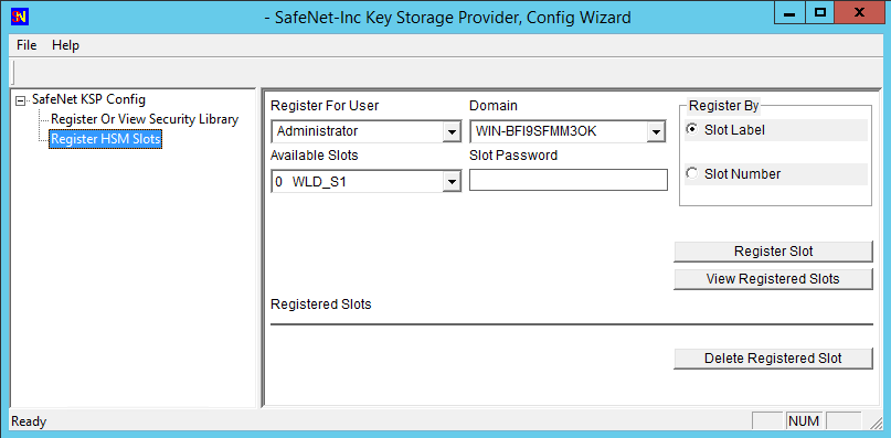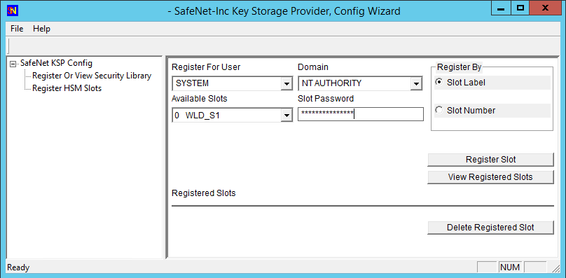6.Return to the Domain pull-down list and select "NT AUTHORITY," supply the password for the slot being registered, and again click “Register Slot” to complete the KSP configuration.