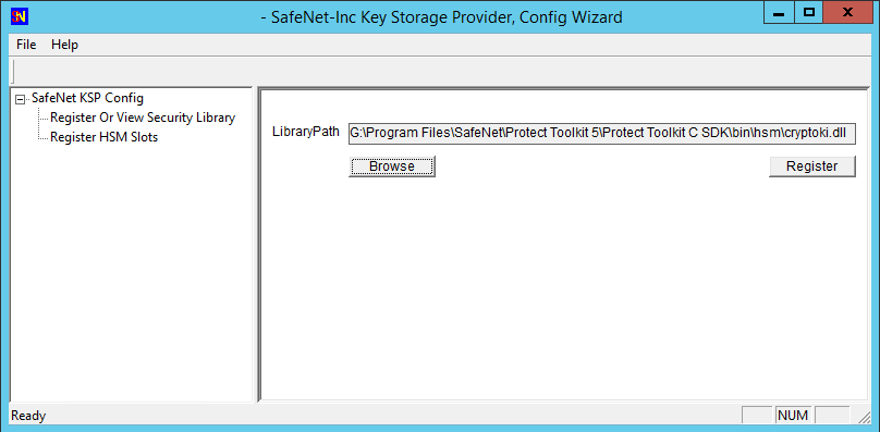 3.In the right-hand pane, browse to the library C:\Program Files\SafeNet\Protect Toolkit 5\Protect Toolkit C SDK\bin\hsm\cryptoki.dll and click Register.