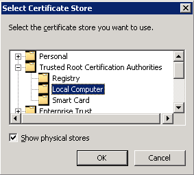 d.In the Select Certificate Store window that opens, put a check in the “Show physical stores” box, locate and expand Trusted Root Certification Authorities and select “Local Computer” then click OK.