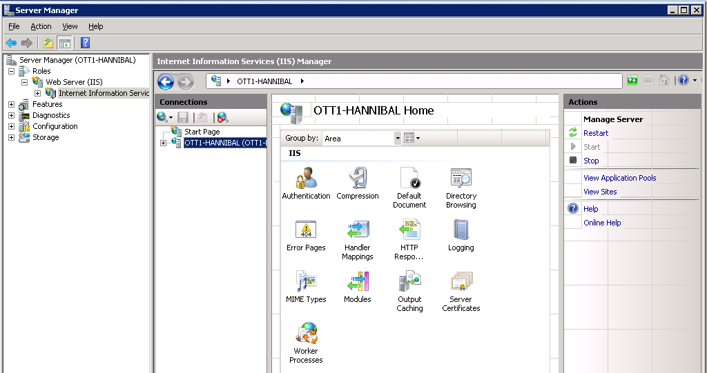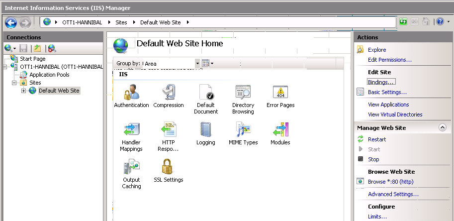 12.Under the Connections pane, expand the server hostname tree (in the example below, OTT1-HANNIBAL), then expand the Sites tree, and select “Default Web Site”: