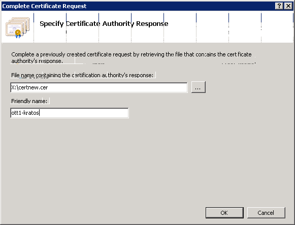 10.Complete the form that opens; select the path to your certificate and choose a friendly name for said certificate and click OK:
