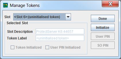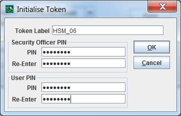 2.Enter a token label, SO PIN and User PIN. A token is considered initialized after entry of the SO PIN. The User PIN does not have to be set until an application requires storage on that slot.