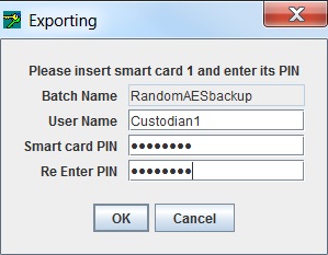 After clicking OK a dialog box displays and shows the Batch Name, a User Name entry field and a Smart card PIN entry field for a custodian (see Importing and Exporting Keys).