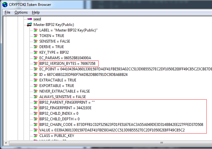 1.Generate a BIP32 master keypair, specifying the seed provided in one of the test vectors (example: Test Vector 1). If you want to confirm the private key, you must set CKA_SENSITIVE=0 during key creation.