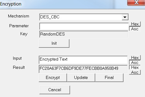 The Parameter, Input, and Result fields all allow display in either hexadecimal or ASCII (text) format. The hexadecimal display is useful for the input, or display, of binary data that cannot normally be displayed. Use the [Hex]/[Asc] buttons to toggle between the two display options.