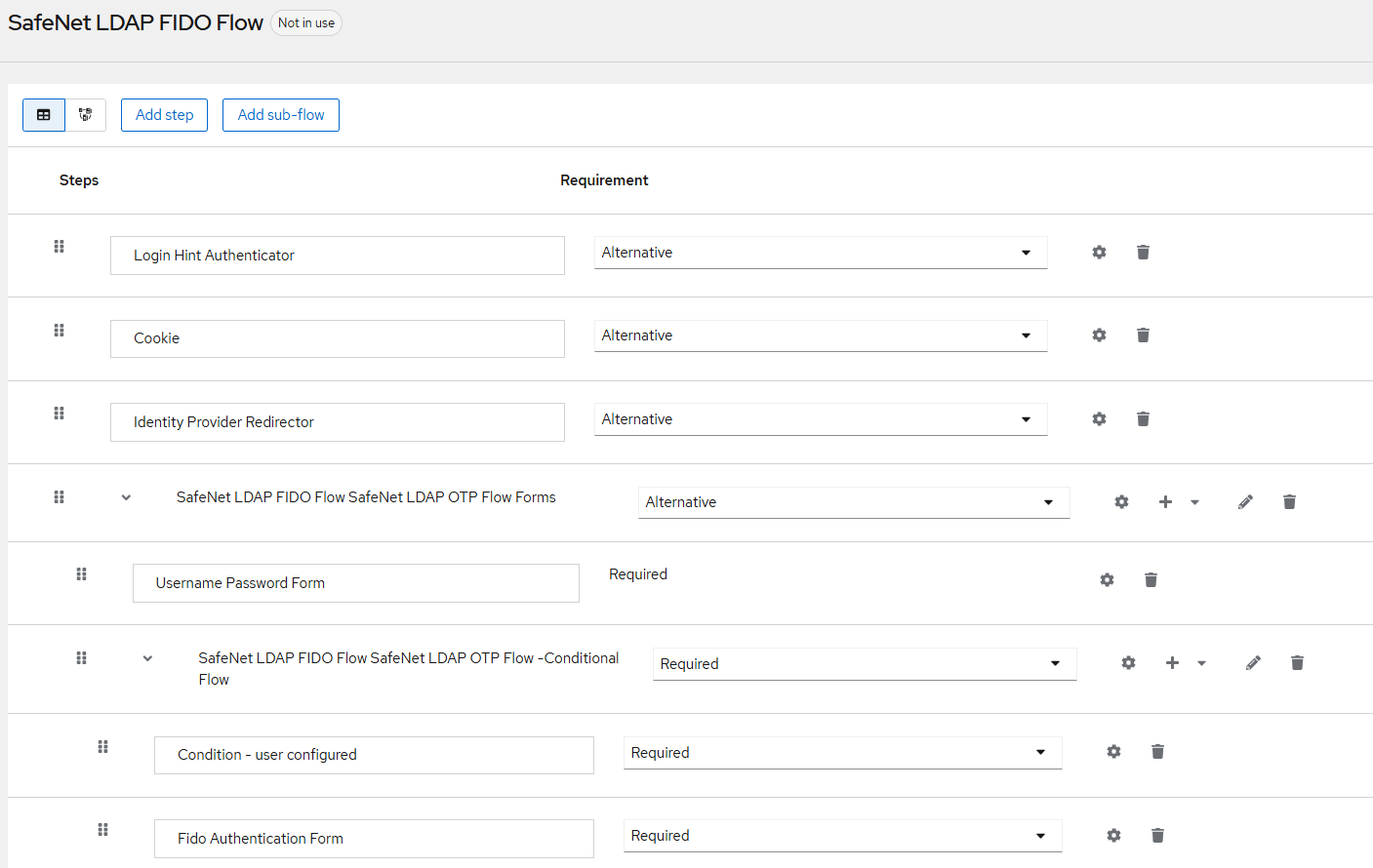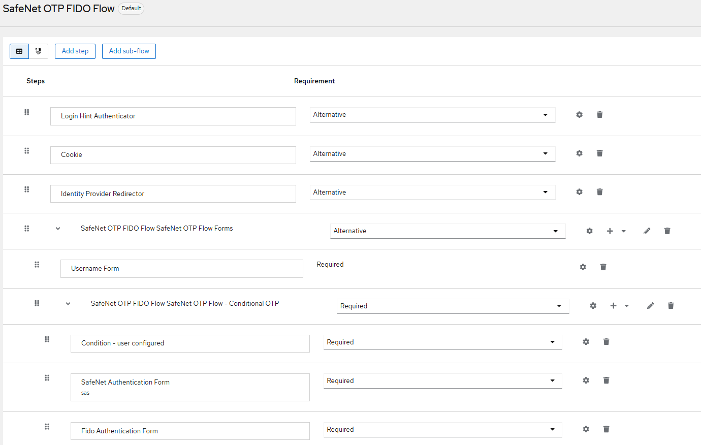 For existing realms, ensure to add the FIDO Authentication Form immediately after the SafeNet Authentication Form at the same level within the authentication flow. Also, add FIDO Authentication Form after the Condition – user configured at the same level.