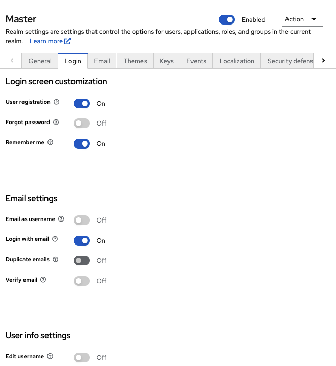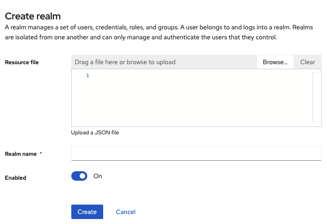 Other realms- These realms are created by the administrator in the master realm. In these realms, administrators manage the users in your organization and the applications they need. The applications are owned by the users.