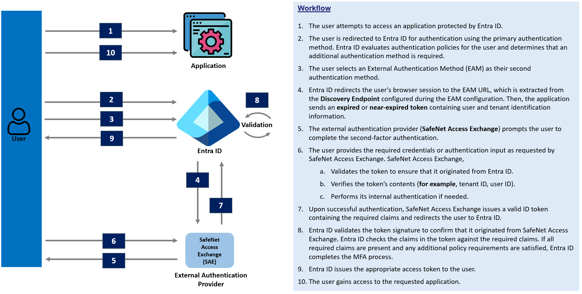 This feature enables customers with Microsoft Entra ID to use SafeNet Authentication Service Private Cloud Edition (SAS PCE) to provide an external authentication method (EAM) through SafeNet Access Exchange (SAE). EAM allows you to integrate external authentication providers, like SAS PCE, to satisfy the multi-factor authentication (MFA) requirements for the resource or application to which access is requested. SAS PCE can satisfy the second factor of an MFA requirement. Microsoft Entra ID can specify the authentication strength and method that SASPCE must use.