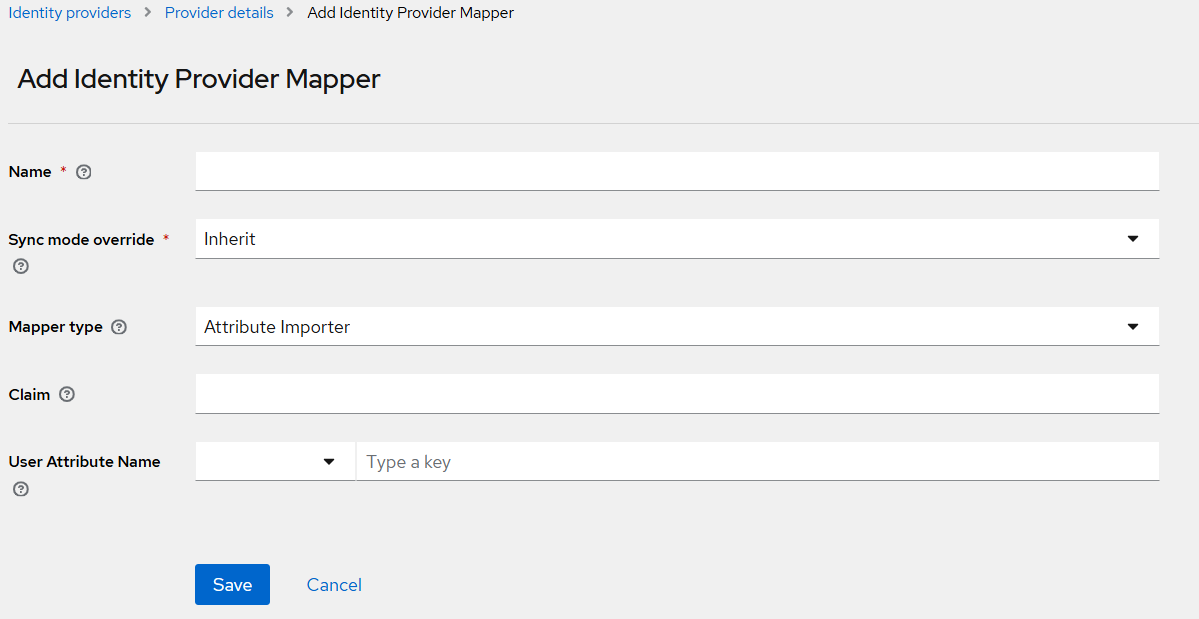 Name Sync mode override Mapper type Claim User Attribute Name immutableId Legacy Attribute Importer immutableId immutableId Timestamp Legacy Attribute Importer Timestamp Timestamp