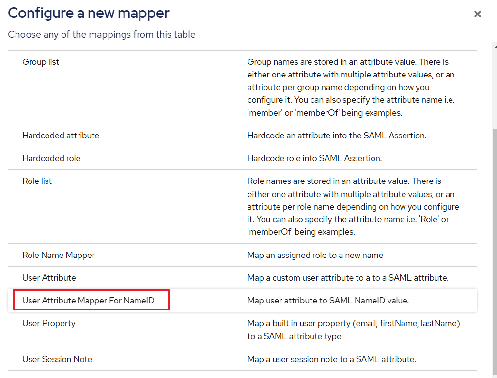 Under Configure a new mapper, select User Attribute Mapper For NameID user return attribute.