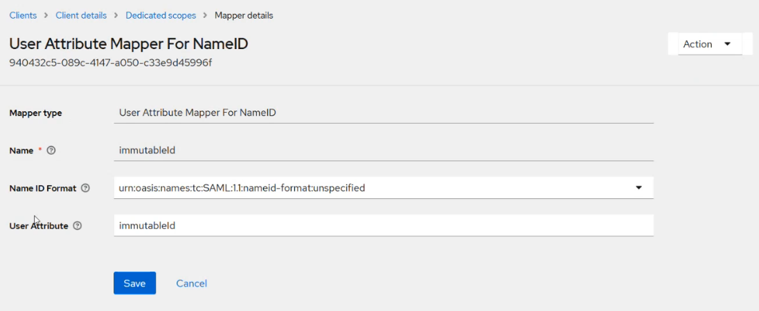 Under Mapper details, in the Name and User Attribute fields, enter immutableId as shown in the screenshot below, and then click Save.