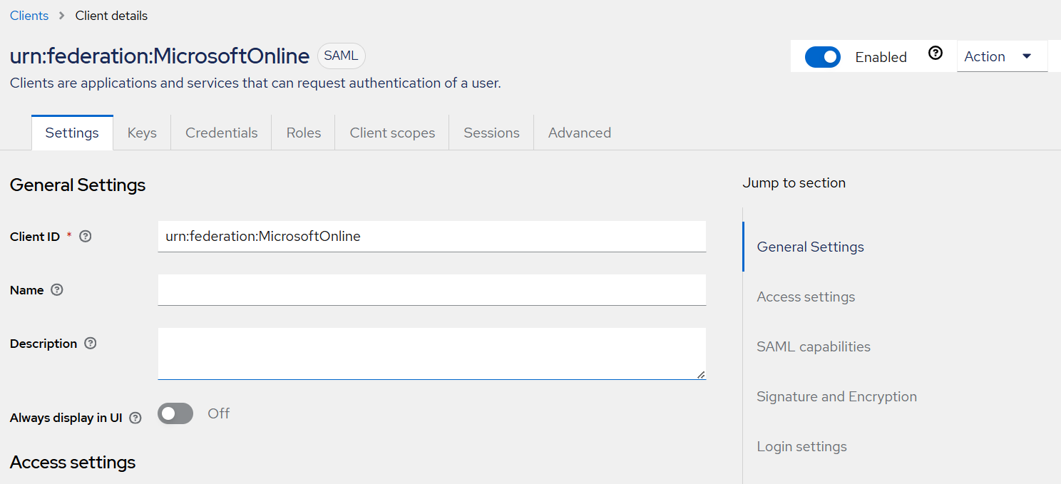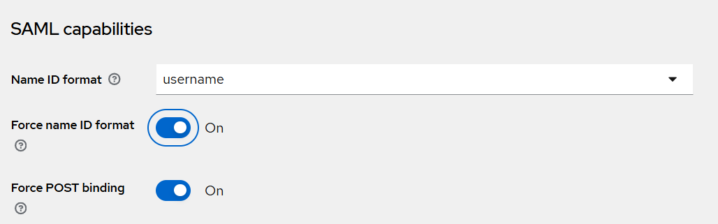 Under SAML capabilities, ensure that username is selected as Name ID Format and Force name ID format toggle is turned On.