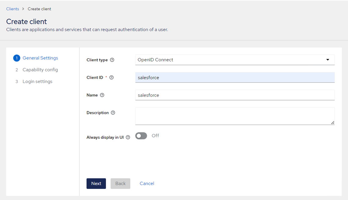 In the Client ID field, enter a client ID (for example, salesforce). This ID is an alpha-numeric string that is used to identify the client in OIDC requests.