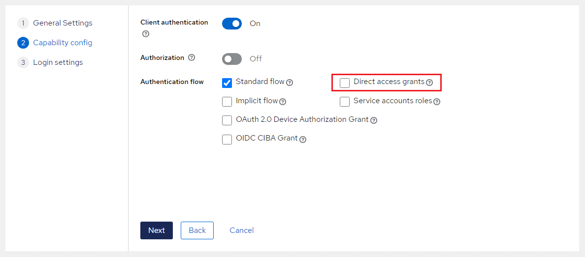 Under Authentication flow field, clear the Direct access grants check box.