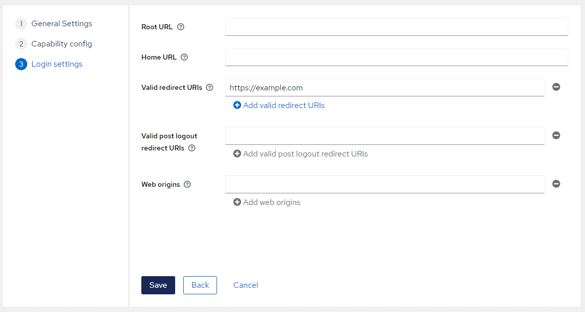 In the Valid Redirect URIs field, enter a dummy value for now (for example, https://example.com). This is required to save the configuration and enable the Credentials tab.
