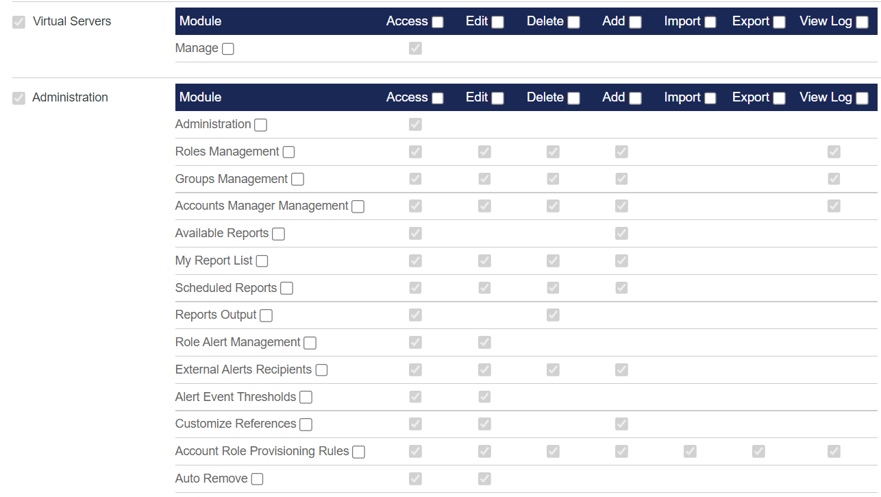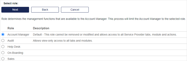 Default Role: The Default role is a Service Provider role that grants access to all Management Console functionality and all Account Management Groups. This role cannot be modified. Account Managers will be automatically assigned to this role if no other roles are created. In general, only a few and trusted Account Managers should have the Default role.