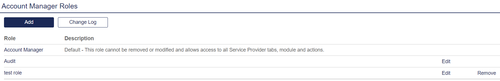 All roles except the default Account Manager and Audit roles can be edited or removed by clicking Edit and Remove respectively. The Account Manager role cannot be removed or edited. The Audit role cannot be removed but can be edited.