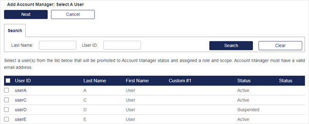 Click Add to display a list of users eligible for promotion to Account Manager status.
