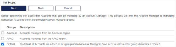 Scope: Select the groups that the new Account Managers can manage. Use the arrows to move highlighted groups between the lists: