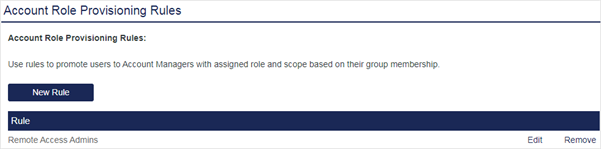 Use account role provisioning rules to automatically add an Account Manager and grant access to the SAS console based on attributes, such as Active Directory group membership. Conversely, an Account Manager can be automatically removed if the rule that promoted the user to Account Manager evaluates false.
