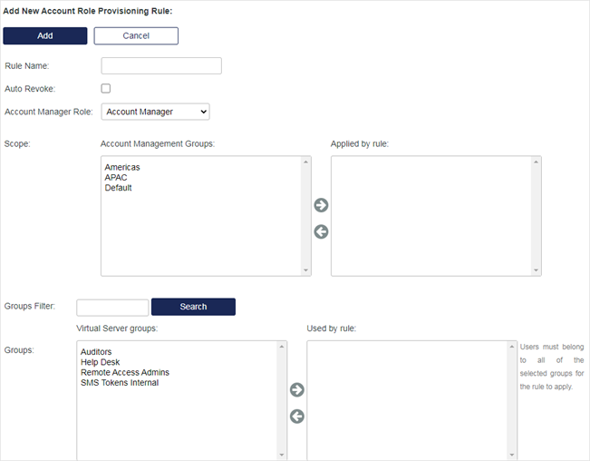 Applied by Rule lists the groups that the Account Manager has access to.