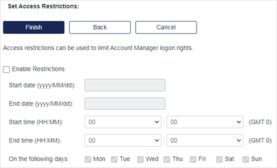 Enable Restrictions: If checked, restrictions are enabled. If cleared, no time/day/date range restrictions are applied.