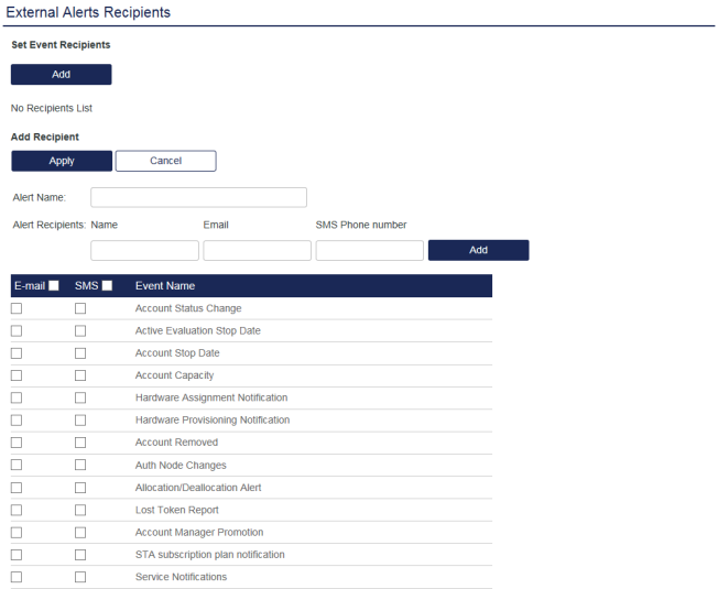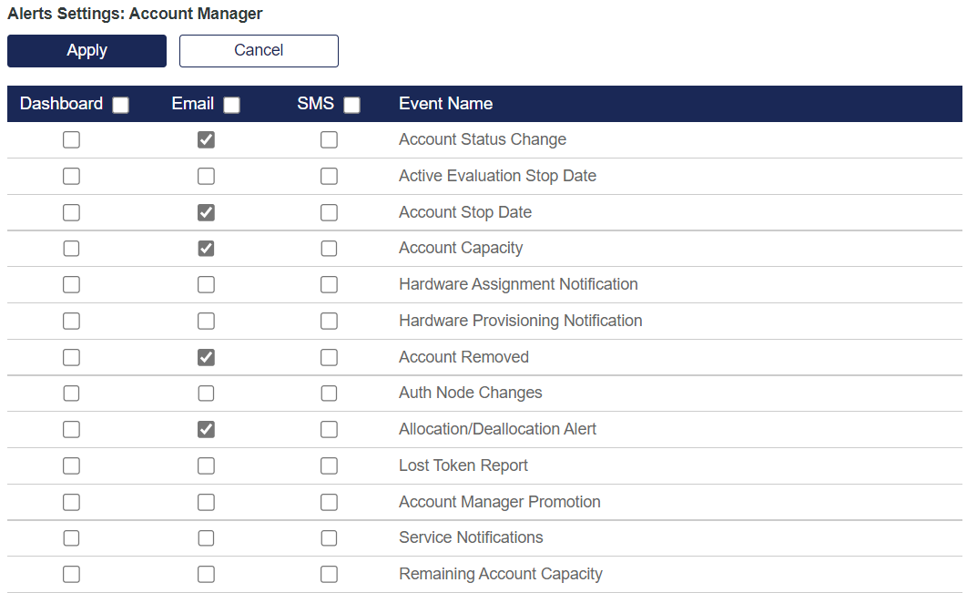 Alerts are associated with Account Manager roles. For each role, you can select the events that generate alerts and set the delivery methods for the alerts. Alerts can be displayed on the Dashboard tab, or delivered by email or SMS to Account Managers with the associated roles.