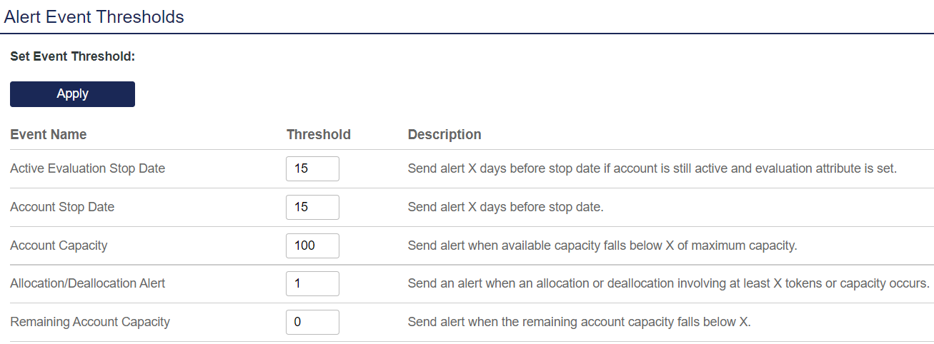 Remaining Account Capacity — The threshols specifies an account’s remaining capacity that triggers an alert.