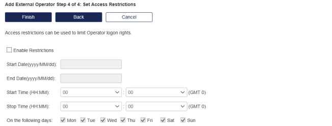 (Optional) Set date, hour, and day access restrictions for the delegated manager.