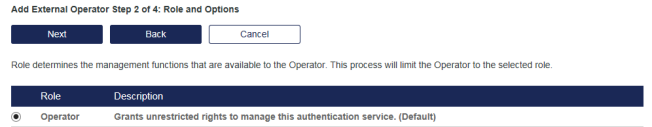 Assign a Role to the External Operator, configured in the Virtual Server, that limits the functionality available to the delegated manager, and then click Next.
