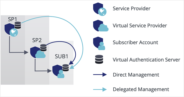 For example, in the following illustration, the Virtual Service Provider SP2 has created and can manage the Subscriber account SUB1. SP2 has also delegated management of SUB1 to their parent account SP1. This permits SP1 to manage the SUB1 account on behalf of SP2.