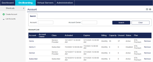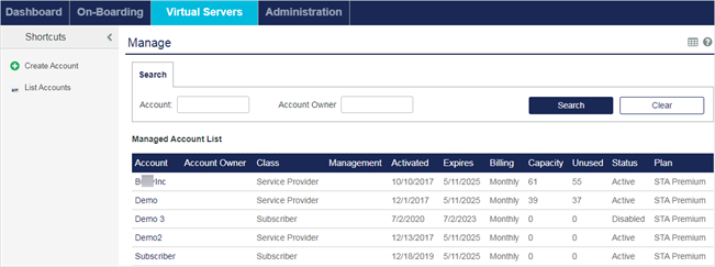 Accounts with management delegated to the service provider are listed on the Virtual Servers tab but not on the On-Boarding tab. On the Virtual Servers tab, the Management column lists the name of the delegating organization.