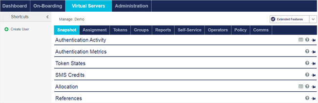 These Virtual Server tabs provide access to manage the account’s users, tokens, reports, policies, and so on.