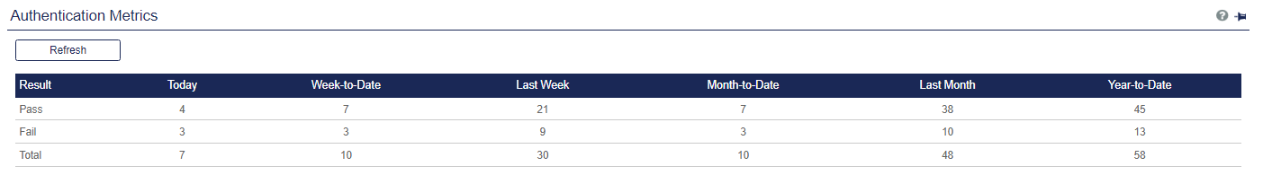 This module displays authentication metrics for the user reflecting pass, fail and total authentication results for the current day, current week, previous week, month to date, previous month, year to date, and previous year.