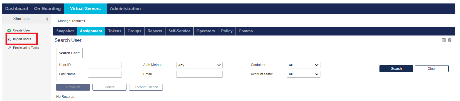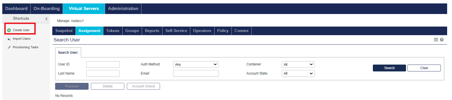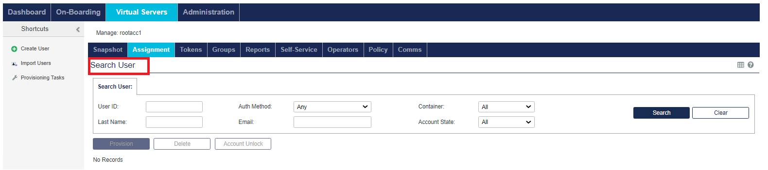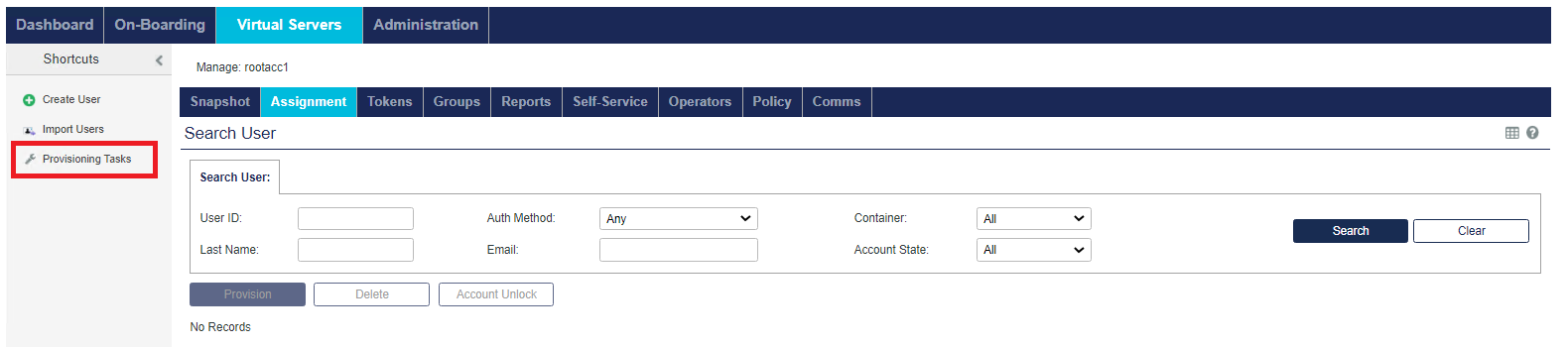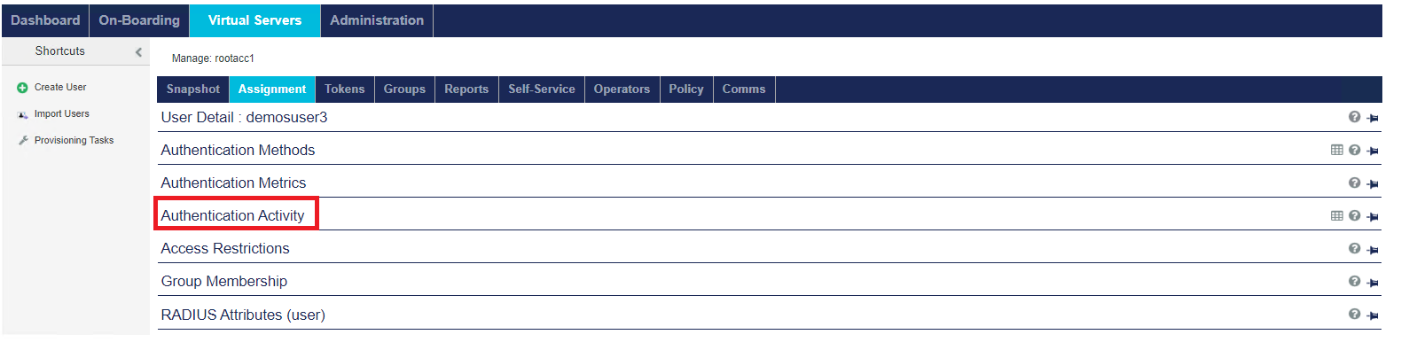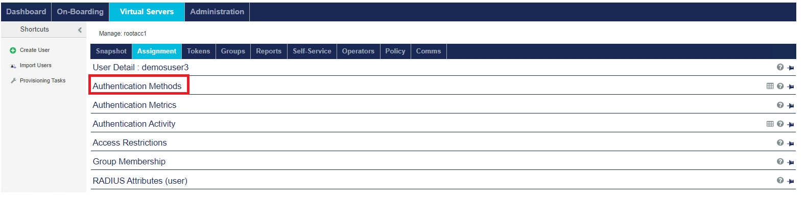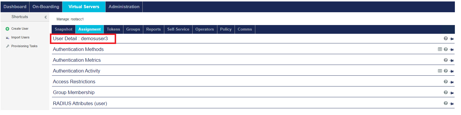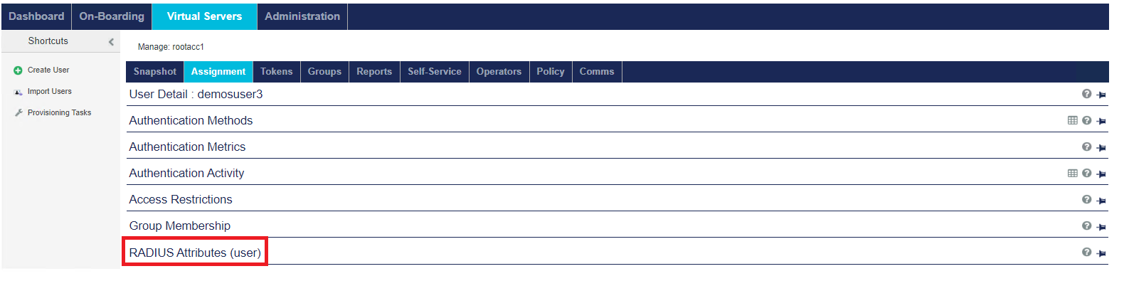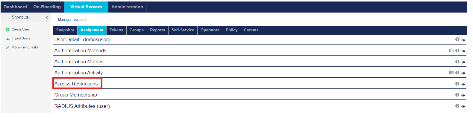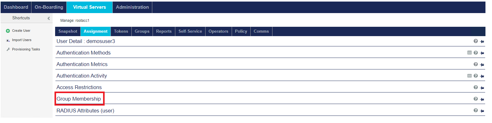 The Virtual Servers > Assignment tab enables you to manage all user: authentication methods/metrics, access restrictions, group memberships, and RADIUS attributes.