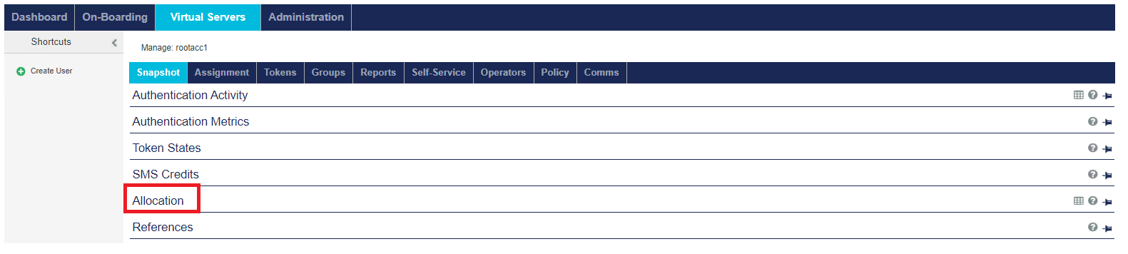 Allocation — A complete listing of Virtual Server capacity and token inventory, including detailed transaction records.