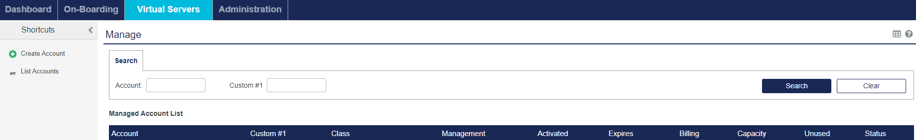 Accounts with management delegated to the Service Provider display on the Virtual Servers tab but not on the On-Boarding tab. The name of the delegating organization displays in the Management column of delegated accounts.
