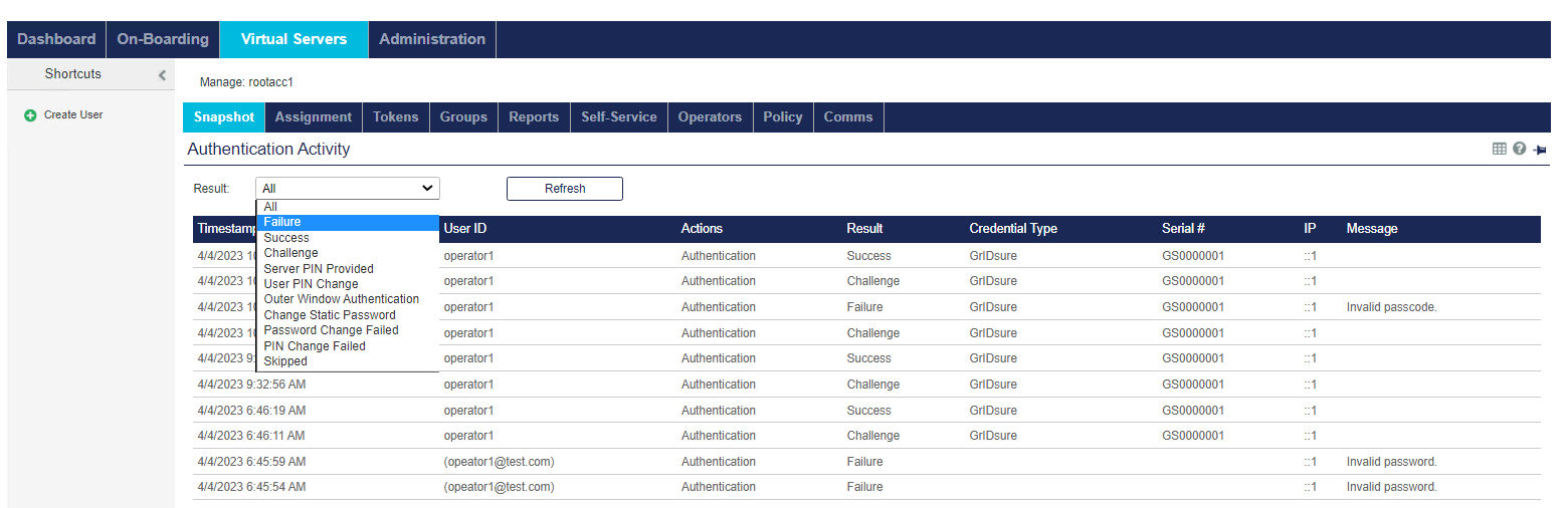Failure — Displays only failed authentications. Note that Push notifications that are rejected (the user tapped It wasn’t me!) are listed as a Failure, with a message to indicate that it was due to user rejection.