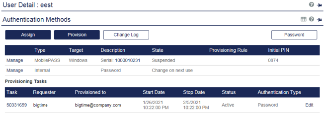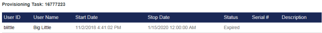 Field Description Task If the operator has provisioning management permissions, this is a hyperlink to the Provisioning Task Management module where the selected task is expanded. Requester This is the UserID of the Operator that created the provisioning task. Provisioned to The email address that the enrollment email was sent to. Start Date This is the date the task was created. Stop Date This is the date by which the user must have completed self-enrollment. Status Indicates the status of the user’s enrollment. Authentication Type This is the token type.