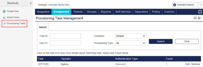 A provisioning task which has been completed (all tokens have been enrolled) is not displayed in this list. Its data is maintained for reporting purposes only.