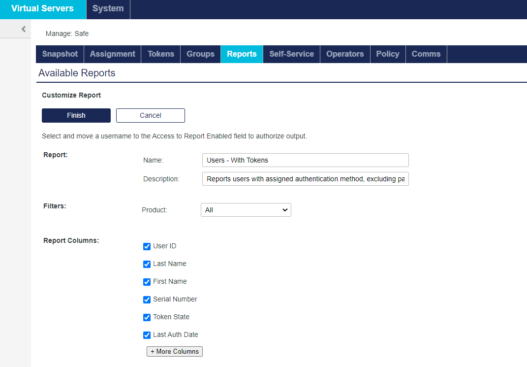 This report can help track MobilePASS+ and Push OTP deployment. It includes token details (OS type, device type, and Push OTP state) for MobilePASS tokens, for all users in a Virtual Server.